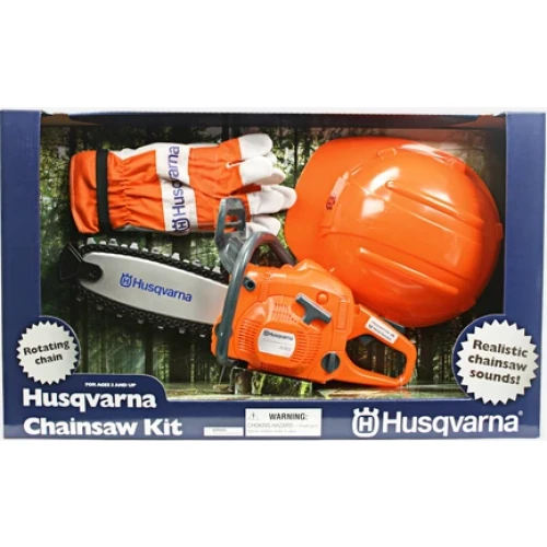 Motorsag med lyd og roterende sagkjede, hjelm og hansker for barn – alt i en flott eske.
